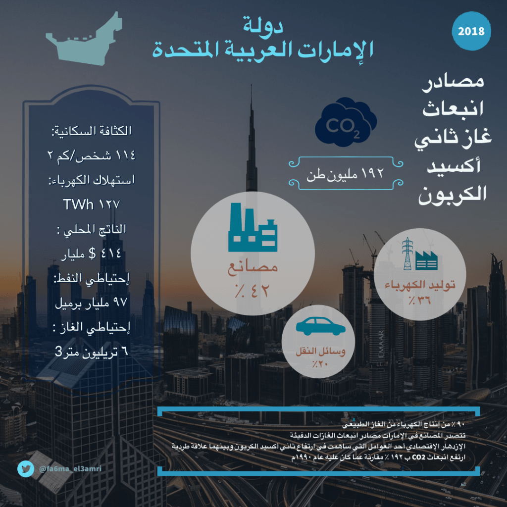 ونتيجة للازدهار الاقتصادي الذي تنعم به منطقة الخليج شهدت على إثر ذلك ارتفاعا في الكثافة السكانية ونجم عنه زيادة في انتاج الكهرباء وعدد السيارات مما ادى إلى زيادة في تركيز غاز ثاني اكسيد الكربون, ولكن كمية الغازات الدفيئة في تراكم مستمر بسبب ندرة النباتات التي التي تساهم في تقليل الكربون من خلال عملية التمثيل الضوئي
