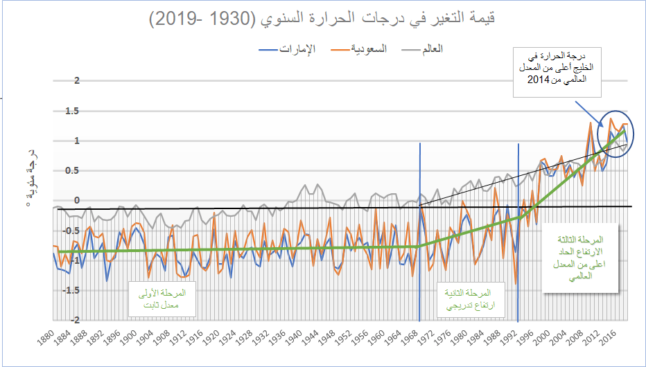هذه المقال يسلط الضوء على دولتين من الجزيرة العربية والأكثر تأثرا بارتفاع درجة وهي الإمارات والسعودية , ويتضمن تحليل شامل لجميع الجوانب التي ترتبط بارتفاع درجة الحرارة بدأ من تاريخ الحرارة للمناطق المذكورة ومتى حدث الارتفاع وما علاقتها بالعوامل الطبيعية لتي تمر بها الارض بلستعراض المتغيرات التي حصلت بعد الازدهار الاقتصادي وعلاقتها بالمناخ مثل كثافة السكان ، التطور العمراني وعامل الألبيدو، رطوبة الساحل وملوحة البحر