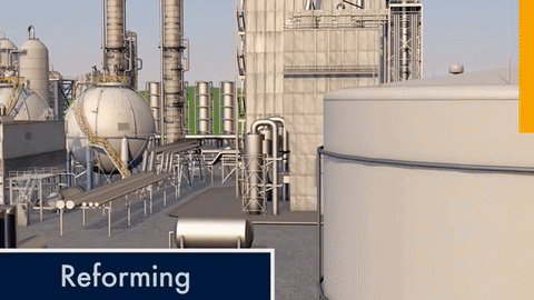 وهنا تتم إعادة تشكيل جزيئات النافثا (الناتجة من عملية التقطير الاساسية)لتنتج وقود السيارات الجازولين، لانهما متشابهان في اعداد الكربون ولكن تختلف عنها في تشكيل الروابط ف تتم إعادة بناءها في درجة عالية وبوجود البلاتين ك محفّز في عملية تسمىreforming ،وينتج عنها ايضا الهيدروجين