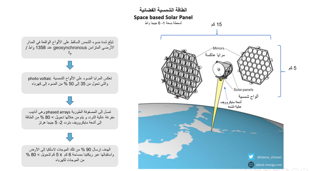 يرتبط ب القمر الصناعي مرايا عاكسة و ألواح شمسية تتموضع في المدار المتزامن مع الأرض الذي يبعد عن سطح الأرض 35000 كم ، تعكس المرايا أشعة الشمس وتوجهها نحو الخلايا الكهروضوئية لإنتاج الكهرباء لإعادة توجيهها لاحقا إلى أنابيب مفرغة عالية التردد ليحول >80 % من الكهرباء لموجات كهرمغناطيسية عن طريق مصفوفة طورية {Phased array}، حيث سيتم استقباله بواسطة ريكتينا {و هي نظام استقبال يحول أشعة الميكروويف لطاقة كهربائية } في مساحة تبلغ 6.5 كم في 8.5 كم ليتم تحويل 85 % من الأشعة لتيار كهربائي مستمر DC current ليحول لاحقا إلى تيار متردد AC و يتم توزيعه إلى الشبكات الكهربائية