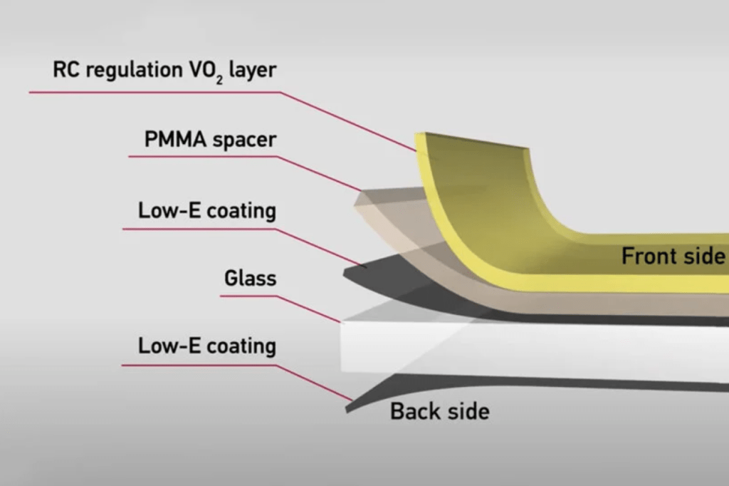 يقال إن الزجاج المبتكر والأول من نوعه يستجيب تلقائيًا لدرجات الحرارة المتغيرة عن طريق التبديل بين التدفئة والتبريد. تم تطويره باستخدام طبقات من جزيئات ثاني أكسيد الفاناديوم النانوية المركبة ، بولي (ميثيل ميثاكريلات) (PMMA) ، وطلاء منخفض الانبعاثية لتشكيل هيكل فريد يمكن أن يوازن التسخين والتبريد في وقت واحد.