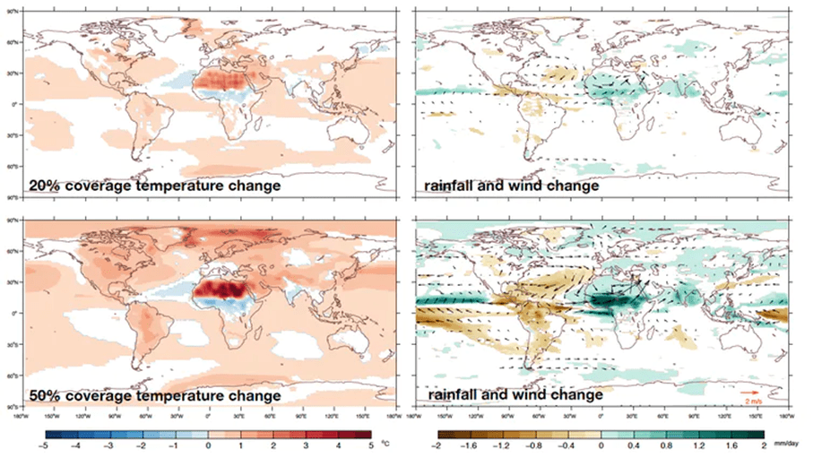 النتائج تعدت التغيير في درجات الحرارة إلى التأثير أيضا على أنماط هطول الأمطار حول العالم، يعمل مصدر الحرارة الجديد الهائل في الصحراء على إعادة تنظيم دوران الهواء والمحيطات على مستوى العالم. النطاق الضيق للأمطار الغزيرة في المناطق المدارية، والذي يمثل أكثر من 30 في المائة من هطول الأمطار العالمي ويدعم الغابات المطيرة في الأمازون وحوض الكونغو، يتحول شمالًا. مما قد يتسبب في حدوث جفاف لمنطقة الأمازون حيث تقل نسبة الرطوبة القادمة من المحيط. وتقريبًا نفس كمية الأمطار الإضافية التي تسقط فوق الصحراء بسبب تأثيرات تعتيم السطح للألواح الشمسية ستُفقد من الأمازون.